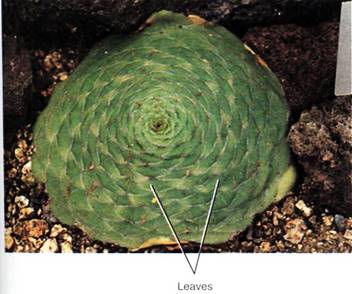 If leaves are small or very long and narrow, self-shading is not a problem, and there may be no petiole; the leaf is then sessile instead of petiolate. For example, Aeonium grows in arid, sunny regions, and its fleshy leaves are packed close together (Fig. 3). Because the sunlight is so intense, even with self-shading the leaves receive enough light for adequate photosynthesis. The close packing of these leaves helps trap water molecules and prevent their escape from the plant.