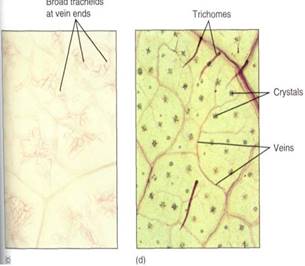 FIGURE 12:These leaves were treated (cleared) to make their cells transparent; then the xylem was stained to make the leaf veins visible. (a) In passionflower (Passiflora) leaves, the veins are narrow and highly branched. At this magnification (X 40), the height of the photograph represents 1 mm, so the veins occur close together. (b) Higher magnification, of privet leaf; at any point in the minor veins, only two or three tracheary elements are present (X 150). (c) These minor veins of crown of thorns (Euphorbia millii, a species that grows in deserts) are broad and have many wide tracheids at the ends (X 50). (d) This leaf of Acalypha has numerous crystals within the leaf and trichomes on the leaf surface (X 80).