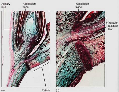 At the leaf base, usually in the petiole, is an abscission zone oriented perpendicular to the petiole; its cells are involved in cutting off the leaf when its useful life is over (Fig. 15).