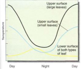 FIGURE 1: At night, both the upper and lower surfaces of a leaf are close to air temperature; some loss of water causes evaporative cooling. After the sun rises, the upper surface rapidly becomes warmer than the surrounding air; in large simple leaves this is much more striking than in small compound leaves.