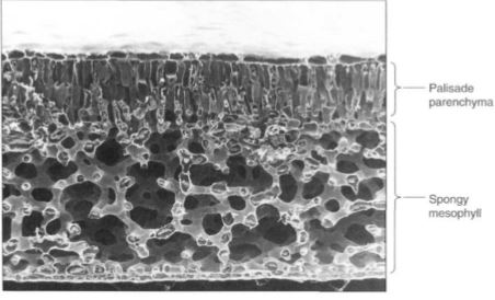 The ground tissues interior to the leaf epidermis are collectively called the mesophyll (Figs. 4 and 6). Along the upper surface of most leaves is a layer of cells, the palisade parenchyma, which is the main photosynthetic tissue of most plants. Palisade cells are separated slightly so that each cell has most of its surface exposed to the carbon dioxide of the intercellular space. Because carbon dioxide dissolves into cytoplasm slowly, the large surface gives maximum area for dissolution; tightly packed cells could not absorb enough carbon dioxide for efficient photosynthesis (Fig. 5). The palisade parenchyma is oifcn only one layer thick, but in regions with intense, penetrating sunlight, it may be three or four layers thick (Fig. 6).