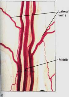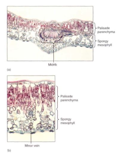Between the palisade parenchyma and the spongy mesophyll are the vascular tissues. A dicot leaf usually has a large midrib, also called a midvein, from which lateral veins emerge that branch into narrow minor veins .Minor veins are most important for releasing water from xylem and loading sugar into phloem, whereas the midrib and lateral veins are involved mostly in conduction. Vein structure changes with size: The midrib and lateral veins always contain both primary xylem on the upper side and primary phloem on the lower side (Fig. 8). Because they both conduct and support the leaf blade, they may have many fibers arranged as a sheath, called a bundle sheath, around the vascular tissues (Fig.9).