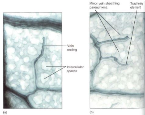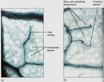 The sheath also makes it difficult for insects to chew into the vascular tissues. Many other types of non-conducting cells such as mucilage, tannin, or starch storage cells may be present in the larger veins. Minor veins are the sites of material exchange with the rest of the mesophyll and must have a large surface area in contact with the palisade and spongy mesophyll; they do not contain fibers or other non-conducting cells whose presence would interrupt this contact (Fig. 10). The endings of the minor veins in some species consist of only xylem and in others only phloem.