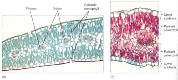 FIGURE 7:Leaves of both carnations (a) and creosote bush (b) have palisade parenchyma along both surfaces. The little spongy mesophyll present is located in the middle of the leaf (a, X 75; b, X 150).