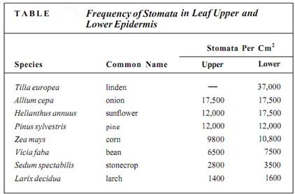 On a clear, sunny day, a leaf is usually warmer than the surrounding air, so it heats the air and convection currents rise from it. If stomata in the upper epidermis are open and losing water, the water molecules are swept away by this convection. However, air tends to be trapped on the underside of a leaf, so water loss from the stomata there is not so great. The molecules are trapped in quiet air and may diffuse back into the stomata. In most leaves, the number of stomata per square centimeter is much greater in the lower than in the upper epidermis; in many species, no stomata at all are found in the upper epidermis (Table).