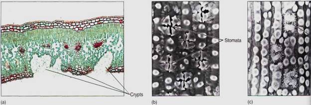 FIGURE 2 :(a) Oleander (Nerium oleander) leaves have stomatal crypts filled with trichomes and stomata. This organization minimizes air movement near the stomata, and water molecules that diffuse out of the stoma may re-enter the stoma by random motion. Crypts occur only in the lower surface (X 80). (b) Each of the stomata of this grass (Elytrostrachys) is overarched by four protrusions from surrounding cells. This too reduces air movement near the stoma (X 940). (c) In this bamboo (Chusqua), stomata are protected by protrusions and wax rods (X 940). (b and c, Courtesy of L G. Clark and X. Londono, Iowa State University)