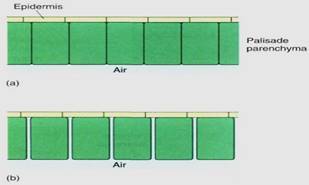 Although this arrangement is the most common, some plants have a layer of palisade parenchyma along both surfaces of the leaf; the spongy mesophyll either occurs in the center or is lacking (Fig. 7). The relationship between leaf position and the sun is important: For leaves that are held horizontally (most leaves), the sun is usually overhead, so having palisade parenchyma on the upper surface permits maximum absorption of light and photosynthesis. For plants that hold their leaves vertically (Iris, Gladiolus, Eucalyptus), tab sides are equally illuminated and palisade parenchyma is equally functional on either side.