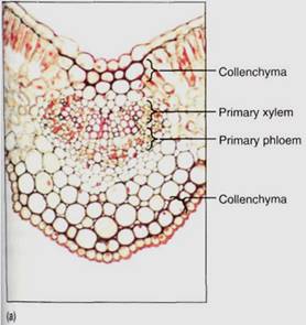 Although the petiole is technically part of the leaf, it serves as the transition between the stem and the blade. Consequently, the arrangement of tissues differs at the two ends. The epidermis may be similar to that on the lamina but often contains fewer stomata and trichomes. The mesophyll is rather like cortex—somewhat compact and not especially aerenchymatous and considerable collenchyma may be present, providing support for the lamina. Vascular tissues are the most variable; one, three, five, or more vascular bundles, called leaf traces, exit the stem vascular cylinder and diverge toward the petiole (Fig. 11a). They may remain distinct or fuse into a single trace at, near, or in the petiole. In some species, they divide into numerous bundles and 10 or 20 (in large palm leaves, several hundred) may be found in the petiole (Fig. 6.26b). Vascular bundles may either fuse with each other within the petiole or branch further; they can be arranged in a ring, a plate, or a number of other patterns. If the lamina has a strong midrib, most of the petiole bundles fuse together and form the midvein, but other bundles may enter the lamina as small lateral veins.