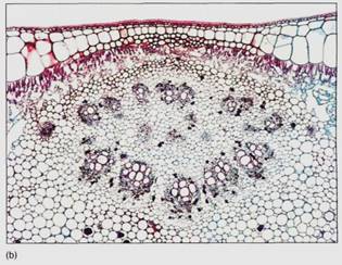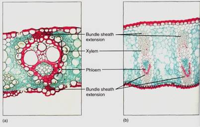FIGURE 9: :(a) This leaf bundle of sugar cane has bundle sheath extensions contacting both the upper and lower epidermis. Water diffuses from the xylem to the epidermis by capillary action, moving around the surfaces of the fibers (X 100). (b) The leaves of flax have large bundle sheath extensions consisting of many layers of fibers (X 45).
