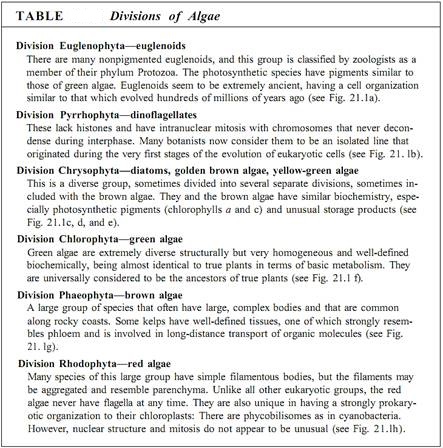 We no longer think so. Green algae are obviously related to land plants, and certain protozoans are clearly related to multicellular animals (Table ; Fig. 1), but many protistans are quite different from plants, animals, or fungi. Among algae, organisms called dinoflagellates (Fig. 1b) have so many relictual features that they may not be truly eukaryotes. Each algal group must have diverged from the others quite early judging by the numerous differences in biochemistry, pigmentation, nutrient reserves, and other features.