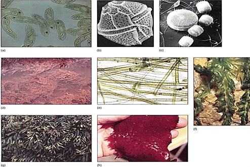 FIGURE 1: (a) Euglenoid algae (division Euglenophyta). (Peter Parks Animals Animals/Oxford Scientific Films) (b)A dmoflagellate (division Pyrrhophyta). (Biophoto Associates) (c) Diatoms (division Chrysophyta). (Courtesy of Greta Fryxell, Texas A and M University) (d) Golden brown algae (division Chrysophyta). (e) Yellow-green algae (division Chrysophyta). (d and e, E. R. Degginger) (f) Green algae (division Chlorophyta). (William E. Ferguson) (g) Brown algae (division Phaeophyta). (E. R. Degginger) (h) Red algae (division Rhodophyta). (William E. Ferguson).