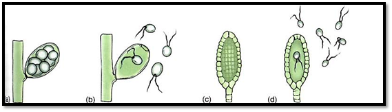 FIGURE 2: Age are distinguished from plants (embryophytes) primarily by the nature of the reproductive structures. (a and b) In algae, the sporangium or gametangium may be either one large cell, as town here, or multicellular, but every cell is converted into a reproductive cell. When reproductive cells are released (b), only the wall of the original cell is left. (c and d) Sporangia and gametangia of plants are always multicellular and only the inner cells differentiate into spores or gametes; after they are liberated (d), a residual layer of sterile cells remains.