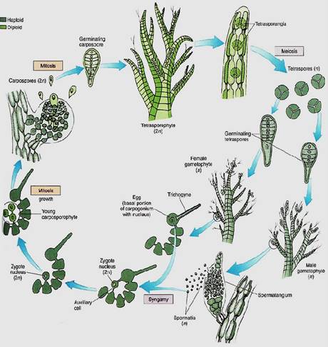 FIGURE 3: Life cycle of a red alga; details are given in text. Note especially the lack of swimming cells and the presence of three generations, one haploid and two diploid.