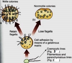 1. Motile colonies (Figs. 1a, 9, and 10): If cells adhere loosely, the resulting structure is a colony, not an individual organism. All cells are similar and none is particularly specialized; there may be some differentiation into two or three somewhat distinct cell types.