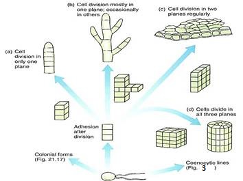 5. If cell division occurs regularly in all three planes, a bulky, three-dimensional parenchymatous body results (Figs. 2d and 21.31). All cells are interconnected by plasmodesmata, and a true parenchyma tissue is formed.
