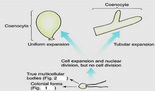 6. A coenocytic or siphonous body results if karyokinesis occurs without cytokinesis, and giant multinucleate cells result (Figs. 3 and 14). The cells can grow to several centimeters in diameter, but they usually remain fairly simple despite their size. Some coenocytes, such as Acetabularia, can be surprisingly complex (Fig. 4):