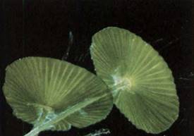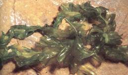FIGURE 12 : Individuals of sea lettuce, Ulva, are sheets two cells thick. They grow to almost any length or width but do not become thicker. If cut or torn into several pieces, each continues to grow. (William E. Ferguson).