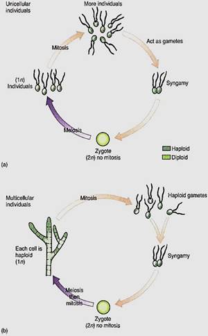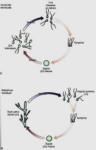 FIGURE 5:In monobiontic life cycles, only one generation—one phase—is capable of undergoing mitosis. In most algae (a and b), the haploid phase is dominant, undergoing mitosis that results in either more unicellular individuals or a multicellular individual. Only one diploid cell occurs—the zygote—and it cannot undergo mitosis; it cannot produce more diploid cells, (c and d, facing page) In a few algae and in all animals, the monobiontic life cycle is dominated by the diploid phase, the only haploid cells being the gametes.