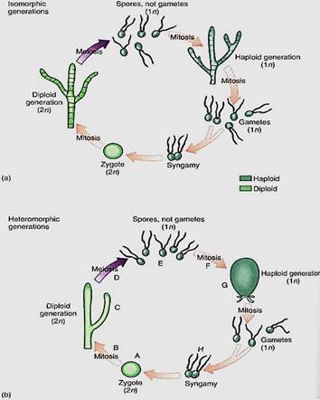 In a dibiontic species in which both stages are multicellular, the gametophyte (haploid phases) and sporophyte (diploid phase) may resemble each other strongly, and alternation of isomorphic generations occurs (Fig. 6a). Or the two may be very different in appearance and construction (alternation of heteromorphic generations), which allows tarn to exploit different ecological niches almost as if they were two species, and gametophytes do not compete directly with sporophytes (Fig. 6b).