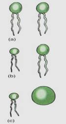 FIGURE 7: (a) Isogametes are identical gametes. Theoretically they could be either motile or nonmotile, but in reality, all known isogametes do have flagella. (b) If the gametes have any visible differences but are still similar, they are anisogametes. (c) Oogametes are obviously different in size, and the megagamete is virtually always nonmotile. In most algae and plants the microgamete has flagella. In flowering plants, conifers, and some algae, microgametes are also nonmotile.