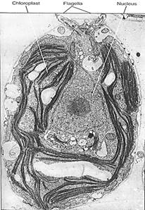 FIGURE 8:The unicellular, haploid green alga Chlamydomonas. Its nucleus, chloroplast, and pyrenoid are visible, but only the bases of the two flagella can be seen. The flagella are at the anterior end; that is, they pull the cell forward rather than pushing it. Several starch grains are present. (U. Goodenough, Washington University).