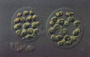 FIGURE 9:Eudorina elegans is a small motile colony of green algae. In each species, the number of cells and their spatial arrangements are constant. The numbers and orientations of cell divisions are controlled. (Walker/Photo Researchers).
