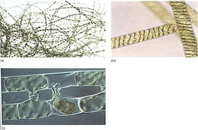 FIGURE 11: (a) Individuals of Ulothrix are uniseriate, unbranched filaments of haploid cells. When the spores or gametes are released, only empty cell walls remain. Sporogenous cells do not have a protective layer of sterile cells surrounding them, whereas the sporogenous cells of flowering plants are surrounded by either the anther wall or the nucellus (X 80). (E. R Degginger) (b) Cells of Spirogyra, showing the spiral, band-shaped chloroplasts. (Runk/Schoenberger from Grant Heilman) (c) Compatible filaments of Spirogyra have been brought together in culture and are undergoing conjugation. This type of plasmogamy is unusual in algae, being analogous to the plasmogamy of fungal hyphae. It superficially resembles conjugation in bacteria, but few details are similar. (M. 1. Walker/Science Source/Photo Researchers, Inc.).