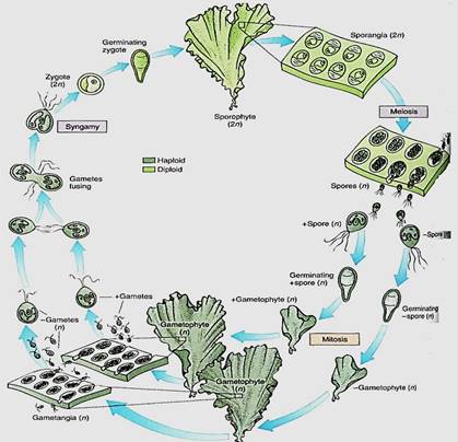 FIGURE 13:Life cycle of Ulva; details are given in text. Two multicellular, isomorphic generations occur. The types of reproductive structures and the size of the nuclei are the only reliable criteria £r distinguishing between sporophytes and gametophytes.