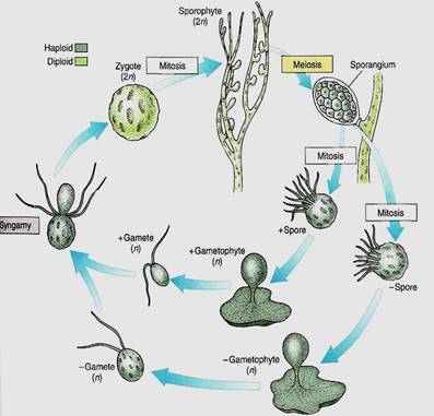 In 1938, P. Kornmann succeeded in obtaining zoospores from Derbesia marina, a branching, filamentous alga made up of giant coenocytic cells (Fig. 14). The zoospores were carefully maintained, but instead of growing into another Derbesia-like individual as expected, they grew into individuals of a totally different genus, Halicystis ovalis (Fig.14). A member of Halicystis looks nothing at all like Derbesia; instead it is composed of a single large, spherical coenocytic cell attached to the substrate by a small holdfast. Almost its entire volume is one giant vacuole, with only a thin layer of protoplasm next to the wall. When mature, Halicystis individuals, which are the gametophyte stage, produce either male or female anisogametes that undergo syngamy and establish the zygote. After germination, the zygote grows into a Derbesia sporophyte. To classify different life stages as different genera is obviously not correct, so the name Halicystis ovalis has been eliminated. Flowering plants also have an alternation of heteromorphic generations, but the gametophytes grow inside the sporophytes, so the question of which goes with which is easily solved.