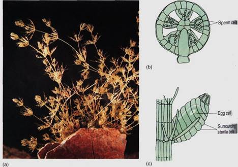 FIGURE 15: (a) An individual of Chara has a strong resemblance to certain aquatic angiosperms, but most of the similarity is analogous (resulting from convergent evolution), not homologous (resulting from descent from a common ancestor). (Runk/Schoenberger from Grant Heilman) (b) The microgametangium of Chara consists of an outer layer of sterile cells. Some inner cells mature into sperm cells, whereas others remain sterile and act as spacers. (c) The megagametangium is multicellular at maturity but not at initiation. The sterile cells around the egg are not sibling cells of the egg but rather are filaments that grow up from the cell below the egg. This is a multicellular gametangium, but it is filamentous, not parenchymatous.