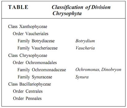 Mambas of division Chrysophyta are grouped into three classes: Bacillariophyceae (diatoms Table ), Chrysophyceae (golden brown algae), and Xanthophyceae (yellow-green algae). Many phycologists think each of tee groups should have its own division, whereas others think they should be classified as brown algae. Division Chrysophyta all have chlorophylls a and c, store their reserve carbohydrate as the polymer chrysolaminarin, and have such abundant accessory carotene and xanthophyll pigments that they mask the chlorophylls. Some have cellulose walls that are frequently encrusted with either silica or calcium carbonate; others have walls with no cellulose but only silica embedded in a matrix of pectin. Some have two anterior, unequal flagella.