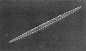 FIGURE 2:Like all pennate diatoms, this Nitzschia pungens is extremely elongate and bilaterally symmetrical. One of its varieties, N. pungens forma multiseries, produces a neurotoxin as the blooms senesce. The toxin is domoic acid, which causes the syndrome amnesiac shellfish poisoning (X 1000). (Courtesy of Greta Fryxell, Texas A and M University)