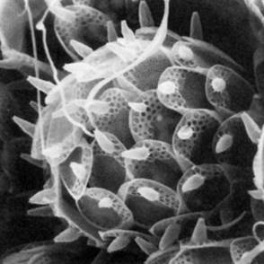 FIGURE 3:Each cell of a golden brown alga is covered with many minute scales that are formed within vesicles of the endoplasmic reticulum. The pattern within each scale is constant for each species, but how it is controlled is unknown. Synura uvella (X 5000). (Courtesy of R. E. Andersen, Bigelow Laboratory for Ocean Science).