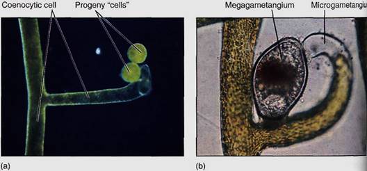 FIGURE 4: (a) Vaucheria occasionally walls off the tip of a coenocyte; then pairs of flagella form near each nucleus. The wall breaks open and the "cell" swims away, settles, and grows into a new individual (X 100). (T. E. Adams/Visuals Unlimited) (b) During sexual reproduction, one segment of the coenocyte forms numerous biflagellate sperm cells, and another forms one large uninucleate egg. After the sperm cells swim away, all that is left of the gametangium is wall; unlike gametangia in true plants, no protective layer of sterile cells is present (X 200). (R Calentine/Visuals Unlimited).