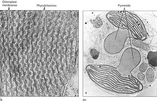 Chloroplasts of red algae may have arisen by an act of endosymbiosis distinct fom the one that produced the plastids of green algae. Red algal chloroplasts are remarkably cyanobacteria in organization and biochemistry, having phycobiliproteins and phycobilisomes arranged on membranes that do not form grana stacks (Fig. 2a). They store a polysaccharide, floridean starch, that resembles glycogen.