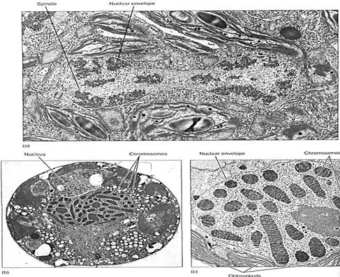 Several groups of organisms with unusual nuclear characteristics may represent lines of evolution that originated earlier in the history of eukaryotes than did plants and animals. the nuclei of many fungi were shown to have an unusual mitosis, some having both an intranuclear and an extranuclear spindle. In many fungal species the nuclear envelope and nucleolus either do not break down at all or do so only late in mitosis. Similar behavior occurs in many groups of algae, including dinoflagellates, brown algae, euglenoids, and some green algae (Fig. 3a). Gaps form in the nuclear envelope, and bundles of microtubules pass completely through the nucleus.