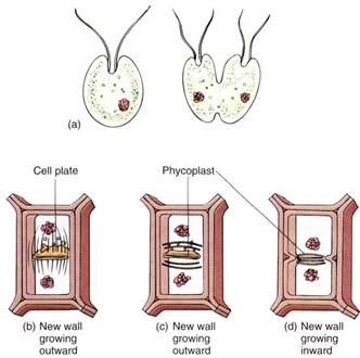 In some green algae, cytokinesis occurs by a different method; the mitotic spindle depolymerizes quickly, and the two daughter nuclei lie close together. A new set of microtubules appears between them, oriented parallel to the plane where the new wall will form, which is perpendicular to the orientation of the spindle. This group of microtubules is a phycoplast and may be associated with division either by furrowing or by cell plate formation (see Fig. 4c and d). Phycoplasts seem to be associated with those green algae whose nuclear envelope does not break down during mitosis, whereas phragmoplasts are associated with the loss of the nuclear envelope. Plants probably arose from green algae that divide with a phragmoplast rather than a phycoplast.