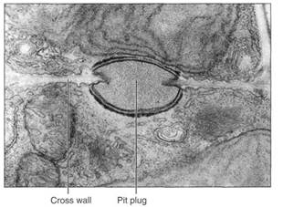 FIGURE 5:Cross walls of red algae are unusual in being incomplete, having a hole in their center. This is closed by a pit plug. Scinaia conjusa (X 15,000). (Courtesy of Curl Pueschell, State University of New Yarn Binghamton)