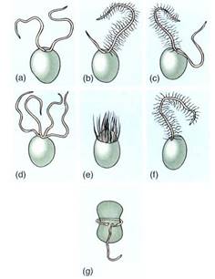 FIGURE 6 :The most common arrangements of flagella in algae. (a) Two equal whiplash. (b) A short whiplash and a long tinsel. (c) Two equally long flagella, one of each type. (d) Four whiplash. (e) Numerous flagella located in a ring (rare). (f) One tinsel flagellum (mostly just in some brown algae). (g) One flagellum trailing, one in a transverse groove (dinoflagellates).