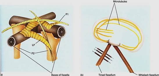 FIGURE 7 :(a) Model of the root structure of Urospora, a green alga, with two massive root fibers (F2) and four narrower ones (F1). All are interconnected and bound to the flagella by lateral fibers (LF). (b) The root structure of brown algae is anchored to the cell by long bands of microtubules. In this generalized diagram, some microtubules extend the entire cell length, and others extend about one third the length.