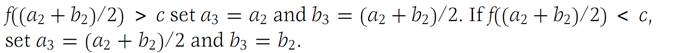 In each of the last two cases we have f(a2)<c and f(b2)>c. Again compute f((a2 + b2)/2). If this value equals c, the result is proved. If