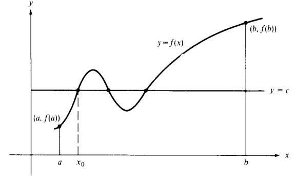 Suppose f is continuous on [a,b], c ∈ R1, f(a)<c, and f(b)>c. Then there is at least one number x0 on [a,b] such that f(x0) =c.