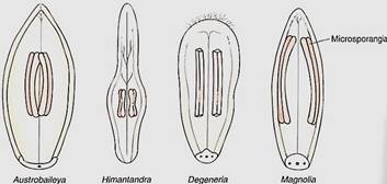The evolutionary transformation of a gymnosperm into a flowering plant was not a simple process, and it involved many alterations. The most obvious, of course, was the conversion of gymnospermous sporophylls into stamens and carpels, resulting in the formation of flowers. Because gymnosperms have rather flat, leaf-like sporophylls, those flowering plants that have similar reproductive parts are believed to be the most relictual. For example, groups such as Magnolia, Austrobaileya, and Degenariahave flat stamens without distinct filament and anther portions, and the sporogenous tissues, the microsporocytes (microspore mother cells), form relatively large, prominent internal masses (Fig. 1).