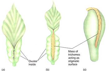 FIGURE 2:Carpels are megasporophylls, so we expect the most relictual living carpels to be rather leaflike, somewhat resembling megasporophylls of cycads . Several living angiosperms do have carpels resembling young leaves that have failed to open (a); the two halves of the blade are pressed together, a rather large amount of vascular tissue is present, and a stigma and style are absent. Hairs along the blade margin act like a stigma. If such a carpel produced ovules only at the base and if the upper part elongated, it would begin to resemble a more derived, modern carpel (c).