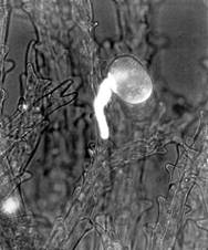 FIGURE 3:In many species of angiosperms, complex compatibility interactions occur between either the pollen and stigma or the pollen tube and stigma/style. In some cases, if the stigma and style detect an improper pollen tube, they deposit callose around it and inhibit its growth. The callose block is visible here as a white sheath (X 60). (Courtesy of H. L. Mogensen, Northern Arizona University).