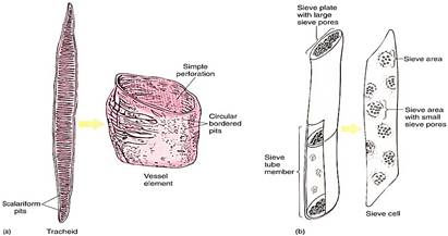 FIGURE 4: (a) In living plants, vessel elements that most closely resemble tracheids are long and narrow; short, wide vessel elements are derived. Most long, narrow vessel elements have scalariform perforation plates, so we assume that these vessel elements evolved from tracheids with scalariform pits. (b) Because a sieve element conducts mostly longitudinally, it is most efficient if the sieve areas and sieve pores on its ends are especially large. When this finally occurred, sieve tube members came into being.