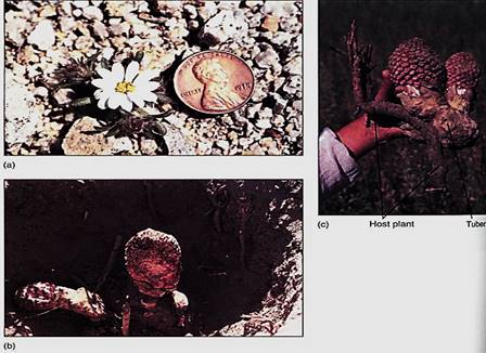 Structural modifications are most easily seen and studied, but probably a more fundamental transition was the acquisition of developmental plasticity, the capacity to survive mutations that alter growth and development. Conifers lack developmental plasticity; £r example, most people never have trouble recognizing an unfamiliar plant as being a conifer when they see one because all conifers greatly resemble each other. They are all large or giant trees with one or a few main stems and needle- or scale-shaped leaves. They are always green or brown, never brightly colored except for the red seeds of yew and Ute gray-blue berry-like cones of junipers. This uniformity is even more striking when one considers that gymnosperms dominated Earth for hundreds of millions of years and could have diversified into almost any habitat. On the other hand, angiosperms have tremendous developmental plasticity: Beginning about 125 to 145 million years ago, they have diversified so greatly that not only hundreds of thousands of species, but also thousands of types, now exist. They range from gigantic (Eucalyptus, oaks, elms) to tiny (mustards, certain daisies; Fig. 5a); woody to herbaceous; perennial to biennial to annual; temperate to tropical; desert habitats to mesic to rainforest to aquatic; autotrophic to partially parasitic to fully parasitic; and epiphytic to subterranean (Fig. 5b) to endophytic (living inside another plant, such as Rafflesia, Tristerix).