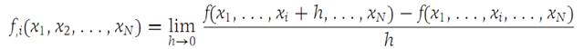 whenever the limit exists. The functions f,1,f,2,...,f,N are called the first partial derivatives of f .