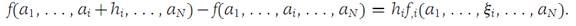 Let τi be the line segment in RN connecting the points (a1,a2,...,ai ,...,aN) and (a1,a2,...,ai +hi ,...,aN). Suppose f is a function from RN into R1 with domain containing τi , and suppose that the domain of f,i contains τi . Then there is a real number ξi on the closed interval in R1 with endpoints ai and ai + hi such that (1.3)