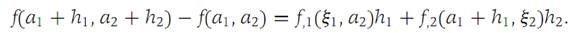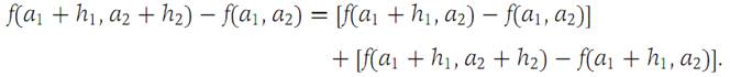 Since f, f,1, and f,2 are defined in an open ball about a =(a1,a2), this identity is valid for h1,h2 in a sufficiently small ball (of radius, say, r) about h1 = h2 = 0. Applying Theorem 1.1 to the right side of equation (1.5), we find that there are numbers ξ1(h1,h2), ξ2(h1,h2) on the closed intervals from a1 to a1 + h1 and from a2 to a2 + h2, respectively, such that (1.6)